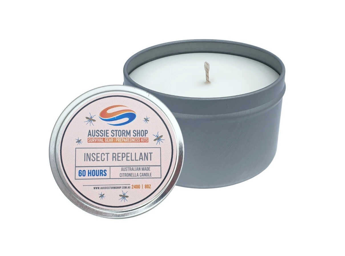 Aussie Storm Shop Emergency + Storm 60 Hour Long BurnĀ CitronellaĀ Survival Candle Introducing our new Australian Made 60 hour Long-LastingĀ CitronellaĀ Survival Candle. It is essential in any Emergency PreppingĀ Kit. These Candles are Australian MadeĀ from Soy wax which means it is healthier for us and the environment. Features infused Citronella to keep those pesky bugs away. Perfect for using outside whether you are camping or relaxing on your patio. Don’t be left stranded this Storm Season with the Aussie Storm Shop Emergency + Storm 60 Hour Long Burn Survival Candle. Features: Last 60 Hours Australian Made! Emergency Lighting for Survival Situations Insect Repellant – Infused Citronella Specifications Weight: 240grams Run Time: 60 Hours Dimensions: Diameter – 8cm, Width – 5cm Made in Australia (60HrCandle_Citronella)