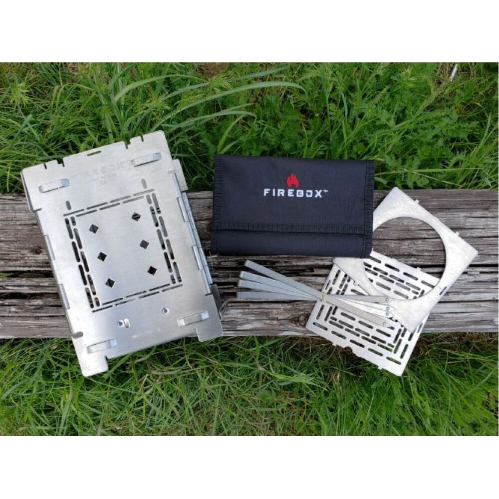 Half the weight of the Stainless Steel G2 5″ Firebox Stove. Cools much faster than Stainless Steel. Low conductivity (See below.) Much higher corrosion resistance. Multi-fuel versatility. No assembly, hinged construction (A true folding stove.) Multiple cooking configurations and multiple accessories (All SS accessories will fit Ti stove.) At half the weight, the Titanium G2 5″ Firebox Stove is very specialized for those wanting the larger size, burn performance, and amazing versatility of its heavy duty big brother which is made of Stainless Steel. Firebox has done extensive testing on this stove and have shown that its performance is better than the original Stainless Steel Firebox. The Titanium’s much lower conductivity means more heat gets reflected back into the fire for an even more efficient burn. Because this stove is so specialized Firebox wanted to make sure that it was a good fit for the market – that there were enough enthusiasts who appreciated its pure awesomeness. Therefore, Firebox is producing limited production runs of the Titanium 5″ Folding Firebox Stove. The Gen2 5″ Titanium Folding Firebox Campfire Stove is a multi-purpose super tool for fire. It’s a multi-fuel cook stove able to utilize wood and other fuels found in nature, solid fuel tablets, alcohol burners, iso-butane gas burners, gel fuels (Sterno), wood pellets or charcoal briquettes. The Folding Firebox’s larger size and sturdy construction makes it stable enough for a large dutch camp oven yet it can be used with cookware as small as a camping cup. The Folding Firebox Stove is also easy to set up. It effortlessly opens into position, and when it’s time to go it folds flat – ready to slide into your pack. Features: Multi-fuel versatility Pre-Fuelable (for less fussing with the fire) No assembly, hinged construction (a true folding stove) High heat output (Boil 2 cups as fast as 2:30min) Multiple cooking configurations, useful accessories Use virtually any size cookware Functions as a portable campfire Use the optional Trangia Gas Burner to convert the Firebox into a Gas Stove This Deluxe Combo Kit Includes: 1x 5″ Titanium Folding Firebox Campfire Stove (Gen 2) 1x Titanium Ashpan 4x Titanium Fire Sticks (2 Pair) 1x Titanium Boil Plate 1x Titanium Grill Plate 1x Heavy Duty Double Layer Nylon Cordura D-Ring Organiser Case Optional Grill Plate Kit is available which adds 1x Titanium Adjustable Fire Grate and 1x Titanium Extended Grill Plate Specifications: Material: Titanium Width: 12.7 cm (5.0″) Height: 19 cm (7.5″) Folded: 0.95 cm (.375″) Weight: 413.9g (stove only) (Ti_FB5inchDLXStove_P)