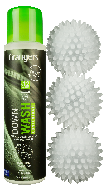 Grangers Down Wash Kit This kit combines the new Down Wash with three handy dryer balls, making cleaning down so much easier An all-in-one kit designed to clean down articles, restore loft and remove unpleasant odours. Grangers Down Wash Kit is a complete product protection package designed to make caring for all down-filled articles as easy as possible. Each kit contains one bottle of Grangers Down Wash and three reusable drying balls. Picking the right detergent when washing down items is incredibly important. Regular household laundry detergents may leave garments looking clean, but they also leave various chemical residues behind after washing – reducing a garment’s ability to insulate or repel water. Grangers Down Wash, on the other hand, has been formulated to thoroughly clean down items without damaging the delicate material within. Just as important as washing down correctly is ensuring that it is dried correctly. Tumble drying down articles is always the best way to maintain their loft and prevent clumping – thereby prolonging the life of the article and improving its performance. Drying for two to three hours on a low heat is recommended, with all three drying balls being used for the duration of the drying process. Grangers Down Wash Kit is suitable for use on all down-filled clothing and equipment, including sleeping bags, jackets, and gilets. Features: Powerful cleaning for down and synthetic down Removes dirt Restores loft Reduces drying times Neutralises odours Revitalises any existing water-repellency 100% PCR and Ocean Waste Plastic (OWP) bottle Bluesign approved PFC-free Specifications: 300ml Made in England Includes: 1 x 300ml Down Wash Concentrate 3 x Reusable Drying Ball (up to 1000 washes) Instructions (BXP.GRF207100)