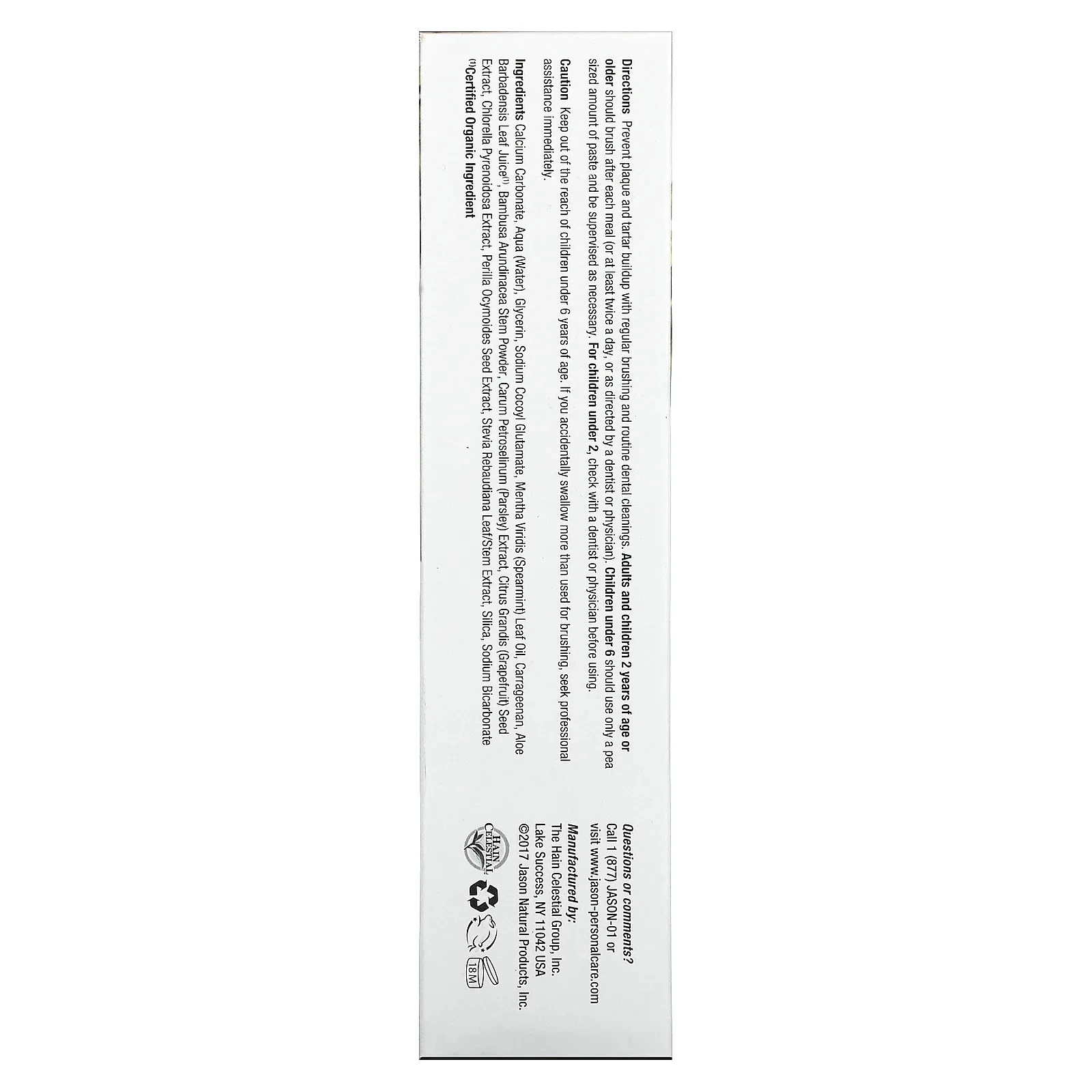 Sea Fresh Strengthening Toothpaste 170g Fluoride Free Fortify your teeth and gums with strengthening Calcium and protein-rich, antioxidant Blue Green Algae. Infused with our gentle blend of stain-fighting whiteners, this botanical paste gives your smile a dazzling sparkle – with a dash of Spearmint and Parsley Extracts for a fully fresh breath. It’s your time to smile and beam with confidence. Jason brand believes in the power of nature’s ingredients to improve everyday wellness. They were pioneers of safer, wholesome personal care, and continue to harness the earth’s bounty of botanicals and essentials for blends that refresh and restore. Wellness is second nature, and it has been since 1959. Features: Fluoride Free, SLS Free & Gluten Free Refreshing Deep Sea Spearmint Flavour No Preservatives, No Artificial Colours, No Artificial Sweeteners, No Saccharin Ingredients: Calcium carbonate, aqua (water), glycerin, sodium cocoyl glutamate, mentha viridis (spearmint) leaf oil, carrageenan, aloe barbadensis leaf juice*, bambusa arundinacea stem powder, carum petroselinum (parsley) extract, citrus grandis (grapefruit) seed extract, chlorella pyrenoidosa extract, perilla ocymoides seed extract, stevia rebaudiana leaf/stem extract, silica, sodium bicarbonate. (2015109)