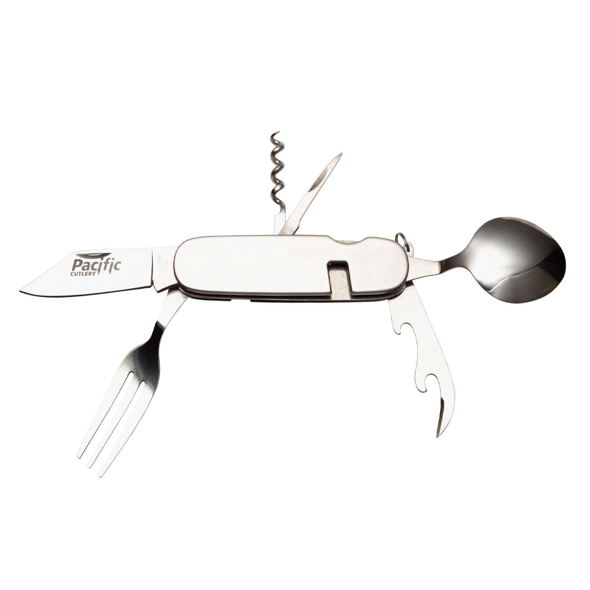 Scout Combo Cutlery Knife Tool The Pacific Cutlery scout combo knife pulls apart by opening the fork and the spoon this handy unit is great for any scout, cadet or adventurer. Manufactured from 100% stainless steel it features a bottle opener, corkscrew, fork, knife, reamer and spoon. Includes a rear lanyard ring for secure carriage. Great Everyday Carry item and save plastic on the go with this tool Features 100% Stainless steel Smart Design easily comes apart to use as a traditional Fork and Knife Set – Simply combine once your meal is finished and pop into the pouch provided Eco-Friendly – Made of Stainless Steel, 100% Reusable and save plastic cutlery when on the go Bottle opener, corkscrew, fork, knife, reamer and spoon Includes a rear lanyard ring for secure carriage. Ideal for camping, trekking, hiking, boating and more Specifications Includes: 1 x Scout Combo Knife With Knife, Fork & Spoon, Bottle Opener, Can Opener, Cork Screw Material: Stainless Steel (YT-390P)