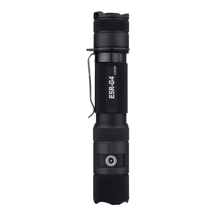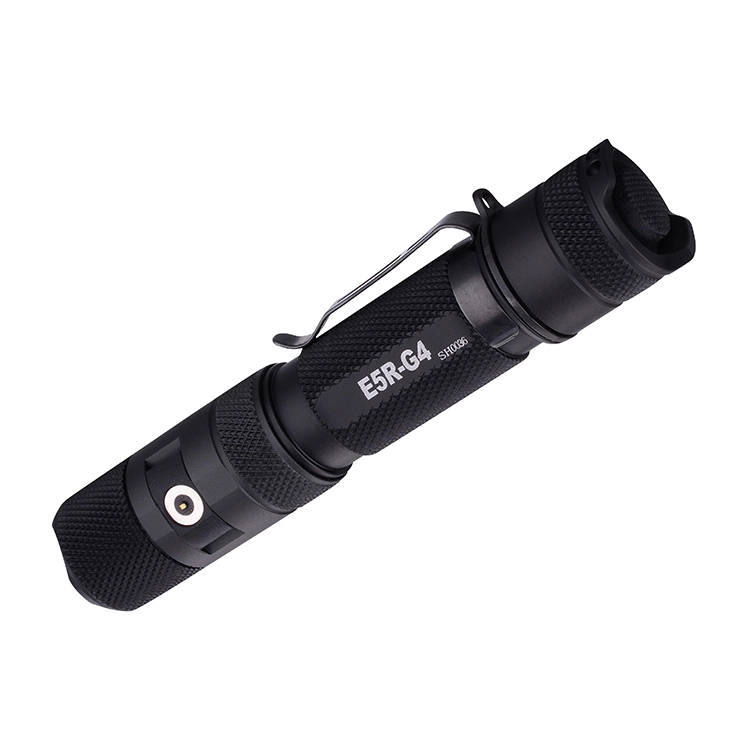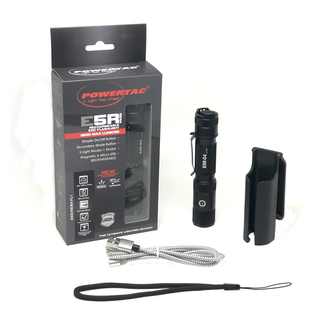 PowerTac E5R-G4 1800 Lumen Rechargeable LED Flashlight The E5R-G4 is the newest generation of Powertac’s workhorse E5 series. It is the perfect light for EDC, police or military duty. The 1800 lumen beam pattern is tight and gives an impressive 320 meters of throw. The magentic charging sytem allows for quick connection for recharging even in low light or with gloves. The E5R-G4 can be a mounted weapons light with the optional Long Gun Kit Upgrade. Features: Massive 1800 Lumens Small, Compact yet extremely durable in harsh environments Huge 320 metres of throw Cree XHP35 White LED Machined Aircraft Aluminium with anit-slip knurling IPX8 Waterproof and Impact resistant to 2 metres Magnetic Charge cable with indicator lights Up to 45 days runtime Specifications: LED Type: Cree XHP35 White LED Battery: (2) CR123A or (1) 18650 High Discharge Rechargeable Li-ion (included) Length: 133.2 mm Bezel Diameter: 25.4 mm Body Diameter: 23 mm Weight: 76g (without battery) Light Output Modes: 1800, 850, 214, 57 or 0.33 (Firefly) lumens + Strobe (670 Lumens) Run Time: 2.01 hours to 45 days Charging Time: 4-6 hours Range: 320 metres Focus Type: Fixed On/Off: Pushbutton, Tail-Cap Material: Anodized aluminum Package Includes: 1x Powertac E5R-G4 Flashlight 1x Powertac 18650 3200mAh Rechargeable Battery 1x Magnetic USB Charge Cable 1x Engineered Holster Spare O-Rings Lanyard Instruction Manual (E5R-G4)