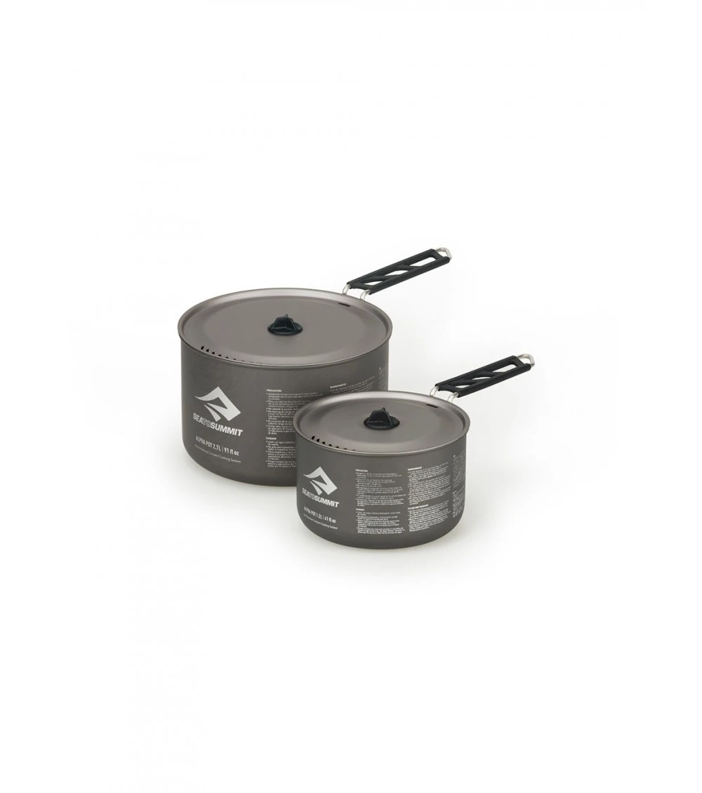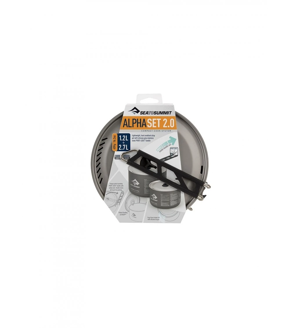 Sometimes two pots are better than one. The AlphaSet⢠2.0 packs up small, and but gives you the extra versatility when trying to bring your inner chef to your camp kitchen.  Features: Set contains a 1.2L and a 2.7L AlphaPot⢠that nest inside each other for compact storage. Patent-pending PIVOT-LOCK⢠provides a secure and easy to operate handle, and folds away for easy packing when not in use Lightweight, hard-anodised alloy is strong, scratch resistant and durable Easy flow strainer lid for efficient draining with integrated patent-pending LID KEEP⢠A textured base improves the stability of the pan on camping stoves A graded scale on the internal surface of both the pots allows easy measurement of volume A large internal radius allows easy cleaning and matches Delta cutlery for scraping and stirring. Handle Locks Lid to pot for packing Specifications: 1.2L Alpha Pot Weight: 187g, In-Use Size: 96mm x 144mm 2.7L Alpha Pot Weight: 282g, In-Use Size: 120mm x 182mm Pot: 100% Hard Anodized Lightweight Aluminium Alloy Handle: Stainless Steel With Silicone Grip Lid: 100% Hard Anodized Lightweight Aluminium Alloy Lid Keep: 100% Silicone Bracket: 100% Hard Anodized Aluminium Alloy Other Components: Stainless Steel And Silicone (APOTASETM)