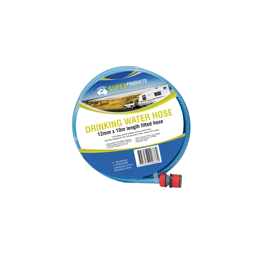 10m Drinking Water Hose with Fittings Non-tainting, food-grade drinking water hose with fittings. Using poor quality drinking water hoses often means that your most precious resource whilst you’re touring is tainted and impure. Fortunately, this can be avoided with this premium food grade drinking water hose that will consistently supply un-tainted water with no metallic taste. Drink your water as fresh as possible! Features Manufactured from non-toxic polyethylene materials, durable and flexible FDA approved to AS/NZS 4020 (Products for use in contact with drinking water) Food grade standards-compliant to FDA21 CFR 177.1520C Non-taint design to eliminate unpleasant odours and tastes Reinforced for standard tap pressures, reducing the dreaded risk of burst or leaking hoses Made in Australia Available with fittings and adaptors for 19mm & 25mm taps for a quick connection Specifications Length: 10m (DRW10HF)