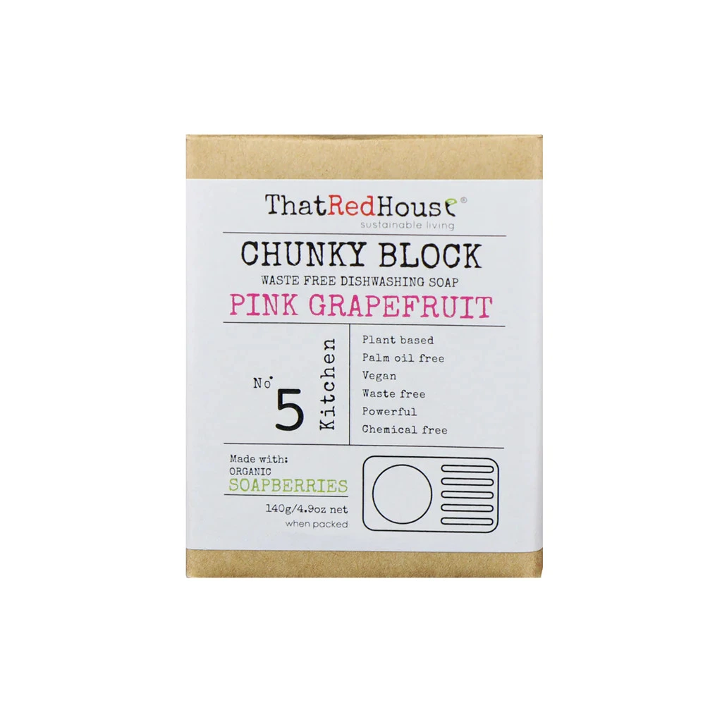 Dishwashing Soap Pink Grapefruit 140g Versatile soap block made using powerful organic Soapberries and Pink Grapefruit essential oil, these chunky multi-purpose soap blocks can replace liquid dishwashing detergent, hand soap, and general cleaning soap in the kitchen and household, even in the outdoors. Vegan-friendly and palm oil free, made from plants and plastic free. Compact & dries out for easy stowing when hiking or camping. Features: Made in Australia Naturally scented with essential oils, avoiding synthetic chemicals and fragrances. Palm oil free., Plastic-free & Vegan friendly Compact – No need to carry extra water Great for minimalist camping and van life Specifications: Size: 140g Dimensions: 7.5cm x 6cm x 3cm (001408)