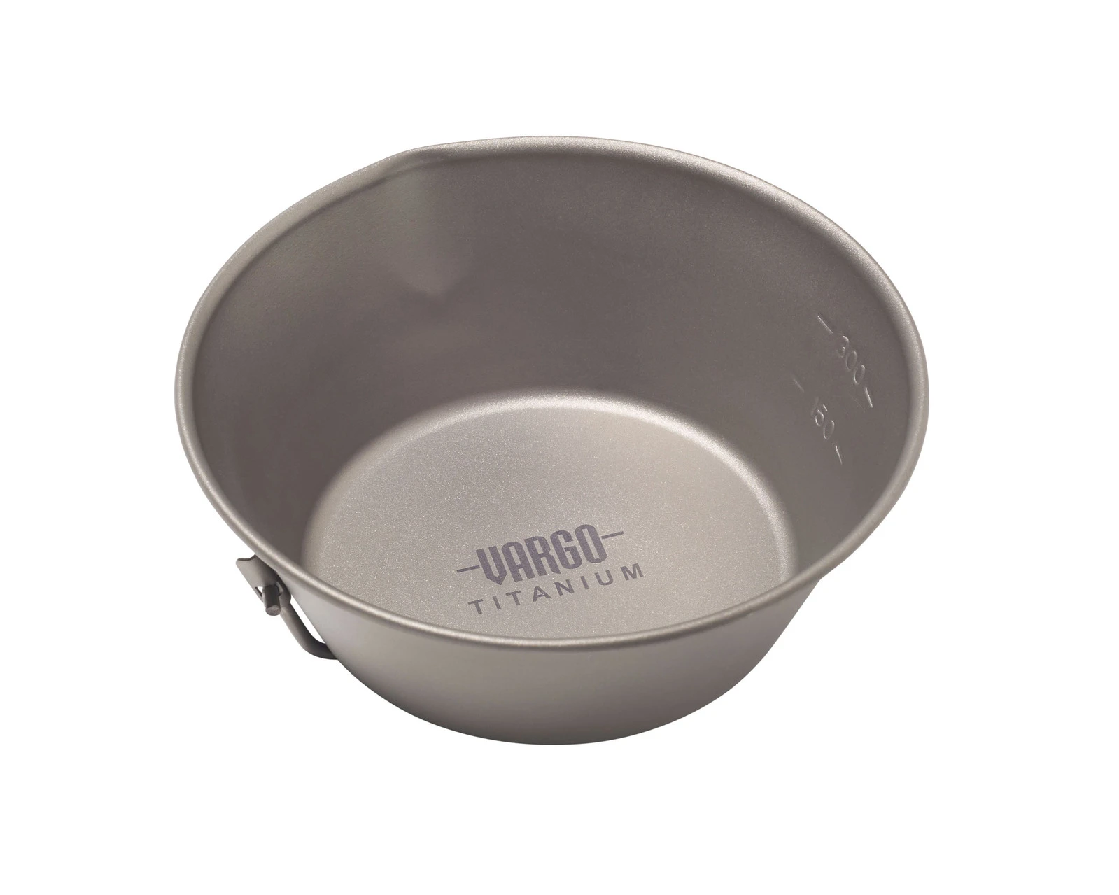 ULTRALIGHT POT/BOWL COMBO Ultralightweight and compact, the pure titanium construction of the Vargo Sierra Cup 450 provides you the multifunctional durability and versatility needed for any backcountry adventure. This midsize cook/dine ware combo with an integrated pour spout is both large enough to use as a cooking pot, yet small enough to eat from as a bowl, allowing for quick and convenient one-dish meal prep. Easy to clean and stack with slanted walls for simple stacking and a folding handle that locks in place, this small addition to your ultralight cook system will deliver big results while keeping your pack as light as possible. FEATURES: 450 ml capacity Ultralight titanium construction Biocompatible Graduated measurements (ml) Pot/bowl capability Integrated pour spout Retractable foldaway handle folds flat and locks in place Nylon mesh bag included for convenient storage SPECIFICATIONS: Weight: 1.95 oz (55g) / with bag- 2.65 oz (75g) Diameter: Top- 5.4 in (138mm) / Bottom- 4 in (100mm) Height: 2.1 in (53mm) (T-309)